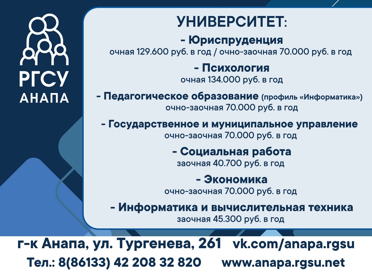 Напоминаем, что Приемная комиссия с 11 марта 2024 года работает ежедневно (кроме субботы и воскресенья)! Если вы давно планируете подать документы в наш ВУЗ (на программы высшего или среднего врофессионального образования) у вас есть возможность сделать это прямо сейчас и поступить по: