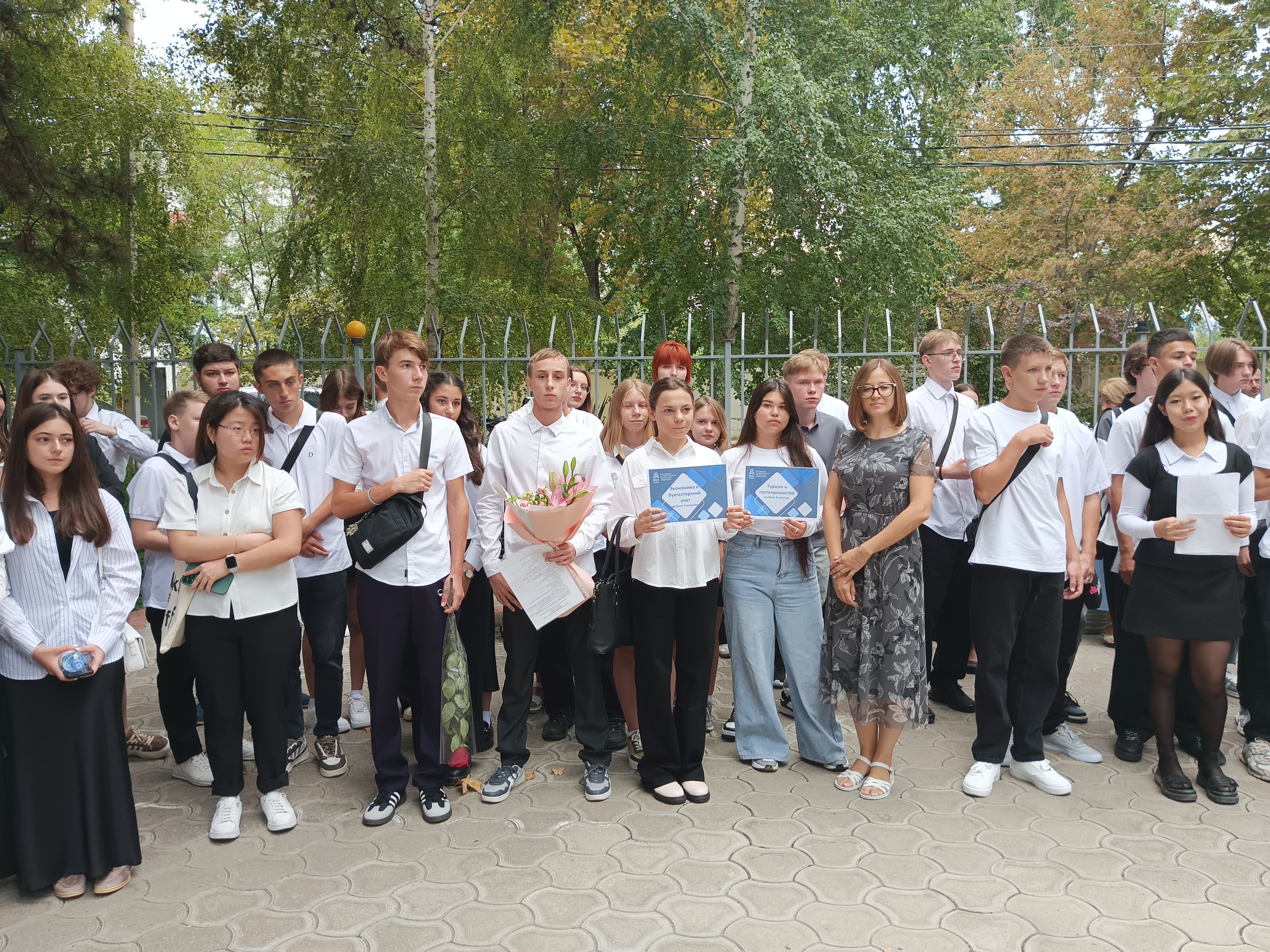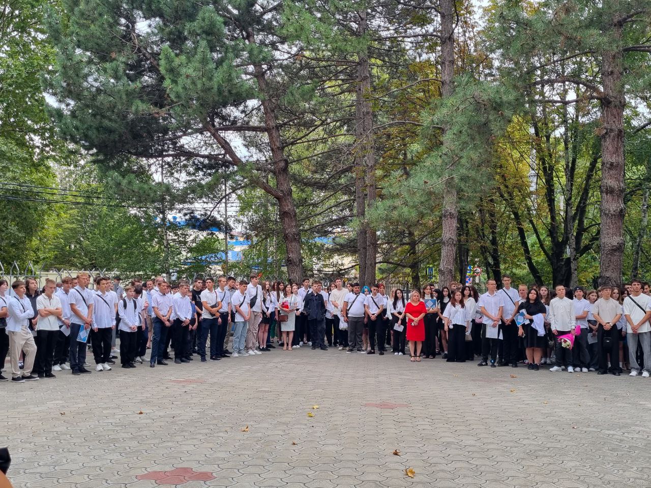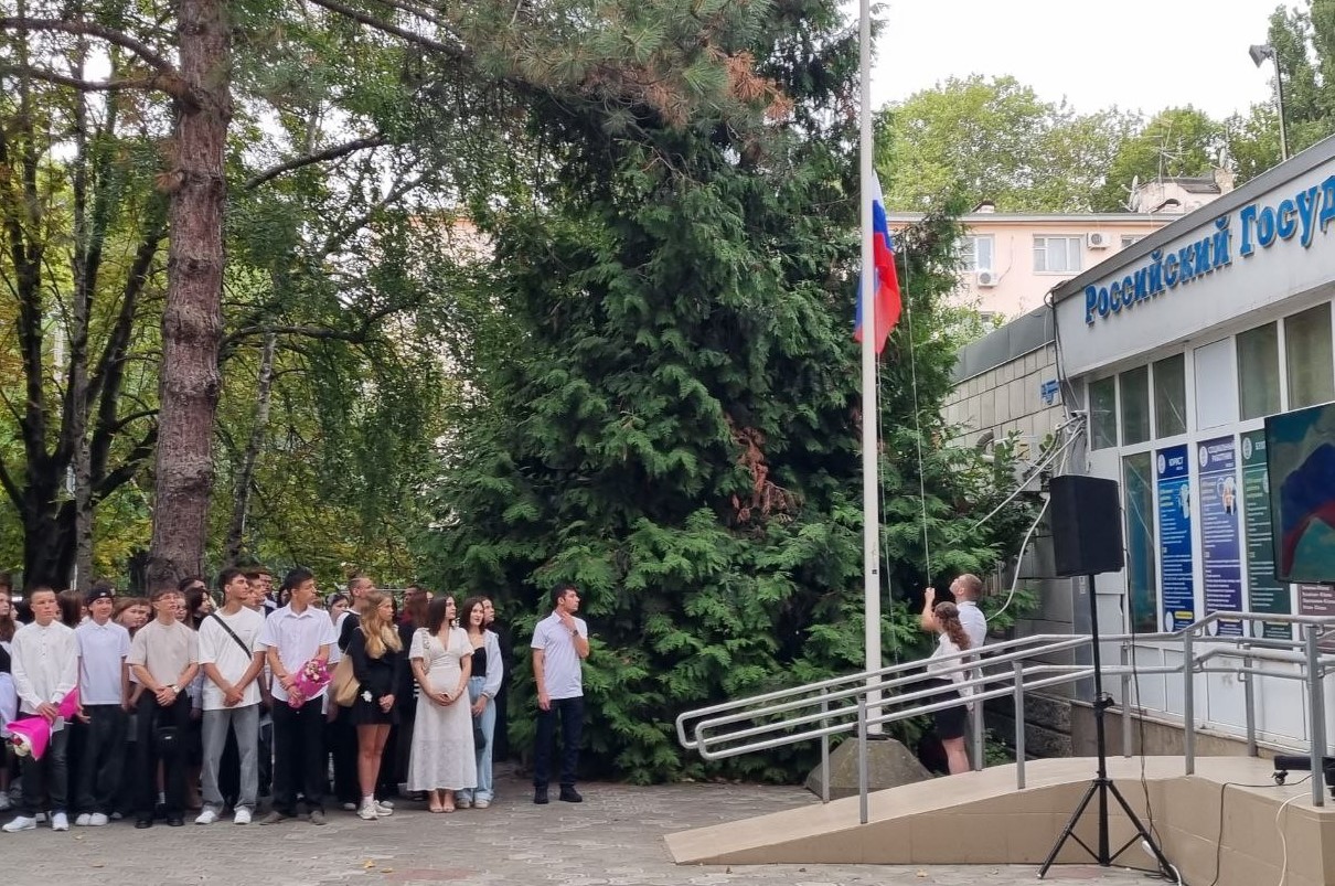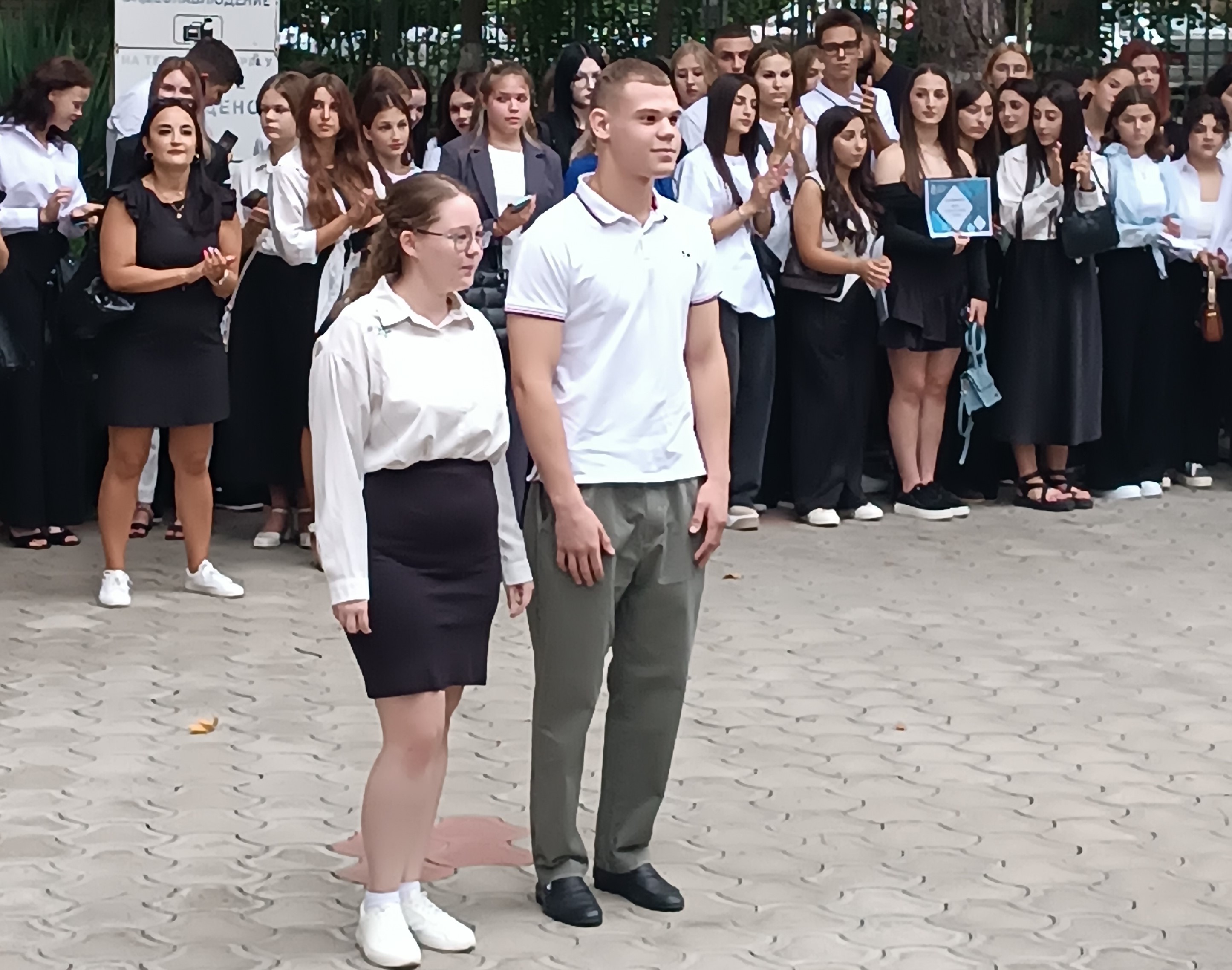 Традионно линейка началась с исполнения Гимна Российской Федерации и поднятия флага нашего государства. Честь поднять флаг выпала лучшим студентам Первого социального в Анапе - обучающемуся 2 курса Колледжа, кандидату в мастера спорта по всестилевому карате, неоднократному победителю Международных и Всероссийских соревнований, призёру II молодёжной премии «Время новых» Фёдору Устинову и обучающейся 3 курса Колледжа, стипендиату губернатора Краснодарского края, неоднократному победителю Всероссийских, Краевых и Муниципальных научно-практических конференций Кире Батовой.