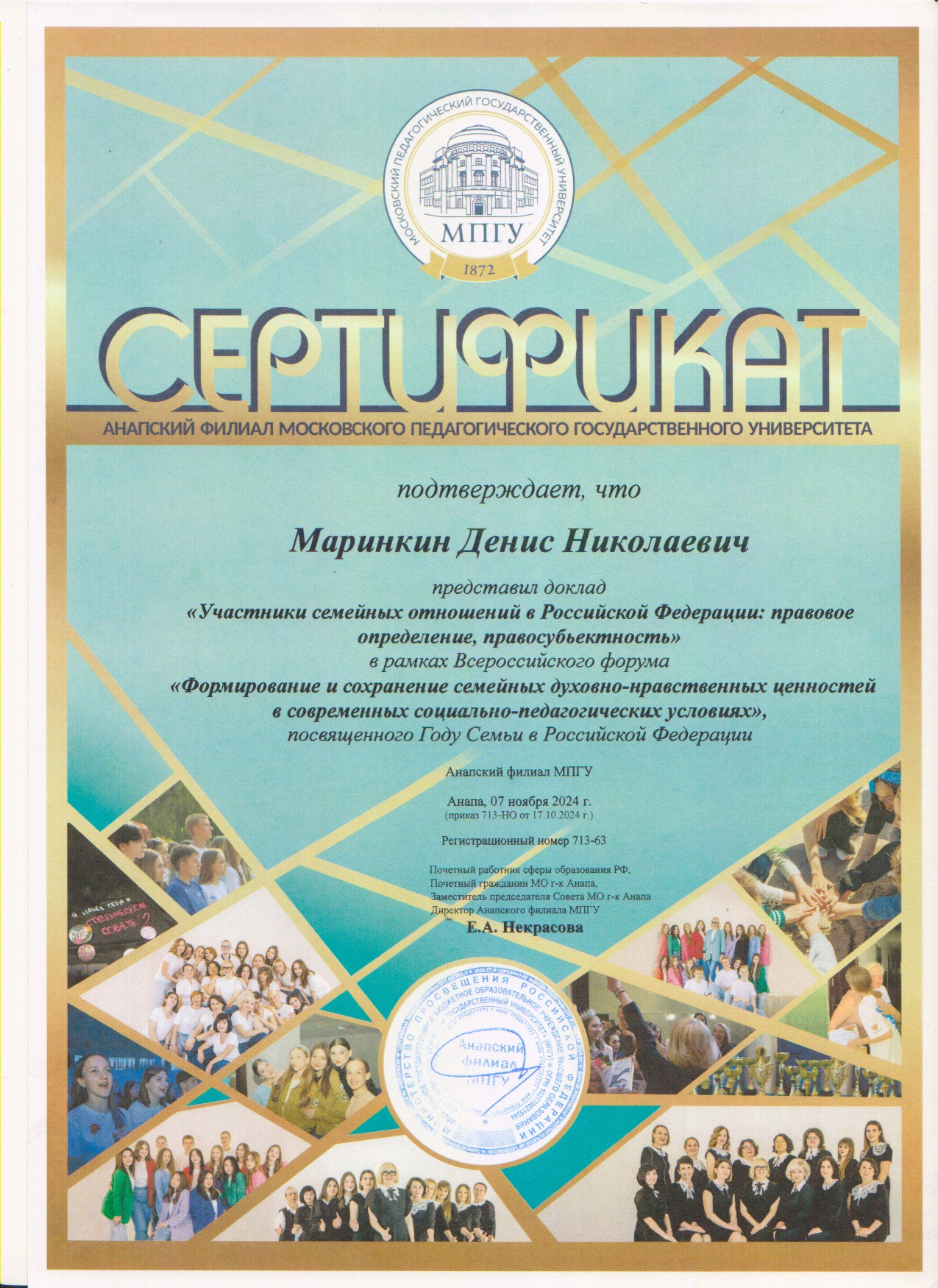 Доцент филиала РГСУ в г.Анапе, кандидат юридических наук, доцент Денис Николаевич Маринкин принял участие в работе дискуссионной площадки «Государственная политика в сфере поддержки семей в Российской Федерации», выступив с докладом на тему «Участники семейных отношений в Российской Федерации: правовое определение, правосубъектность» и приняв участие в обсуждении актуальных вопросов демографической ситуации в мире и России, правовых аспектов и мер поддержки института семьи в России и иных вопросов государственной семейной политики.