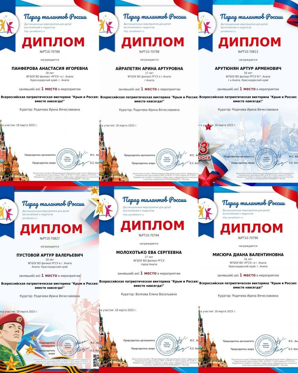 Студенты 2 курса по специальности «Право и организация социального обеспечения» филиала РГСУ в г. Анапе заняли призовые места во Всероссийской патриотической викторине «Крым и Россия: вместе навсегда!».