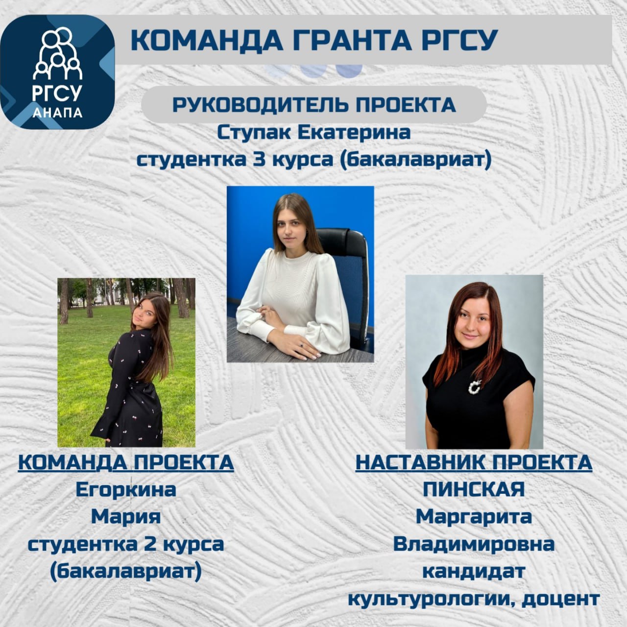 В команде проекта - студенты бакалавриата по направлению подготовки «Юриспруденция» Екатерина Ступак и Мария Егоркина, наставником проекта выступила кандидат культурологии, доцент филиала РГСУ в г. Анапе Маргарита Владимировна Пинская.