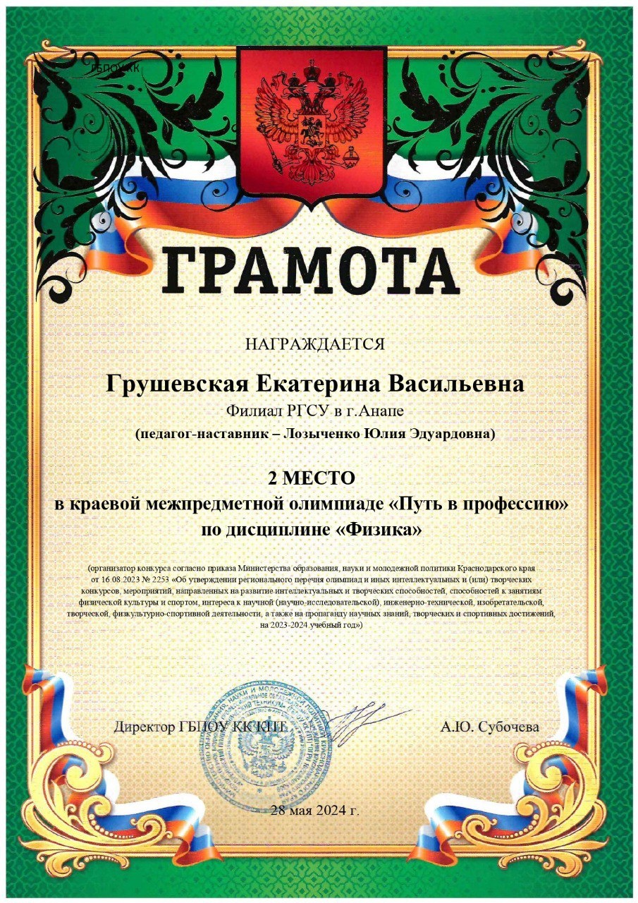 Екатерина Васильевна Грушевская по дисциплине «Физика» (педагог-наставник: Юлия Эдуардовна Лозыченко)