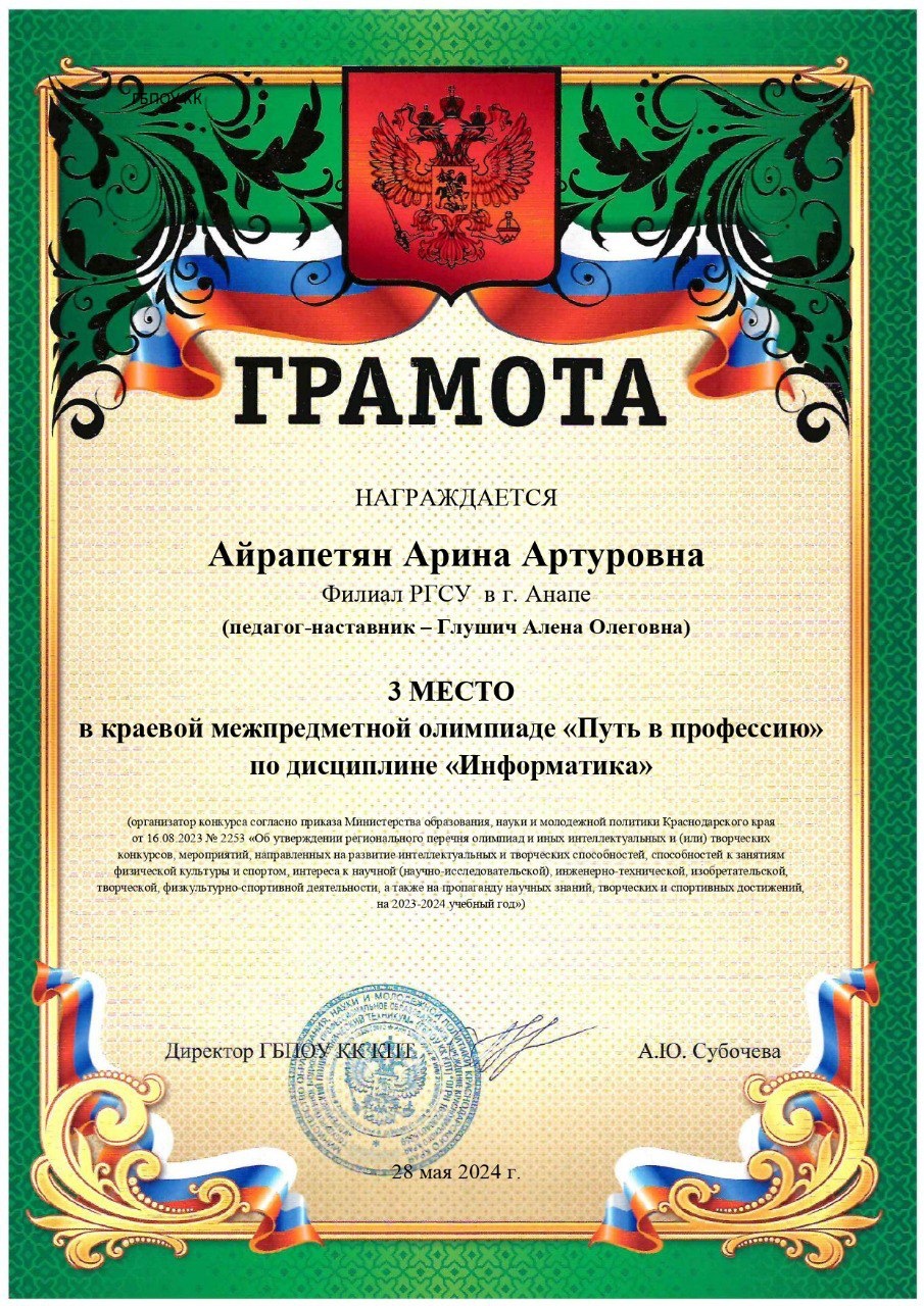 Арина Артуровна Айрапетян по дисциплине «Информатика» (педагог-наставник: Алёна Олеговна Глушич)
