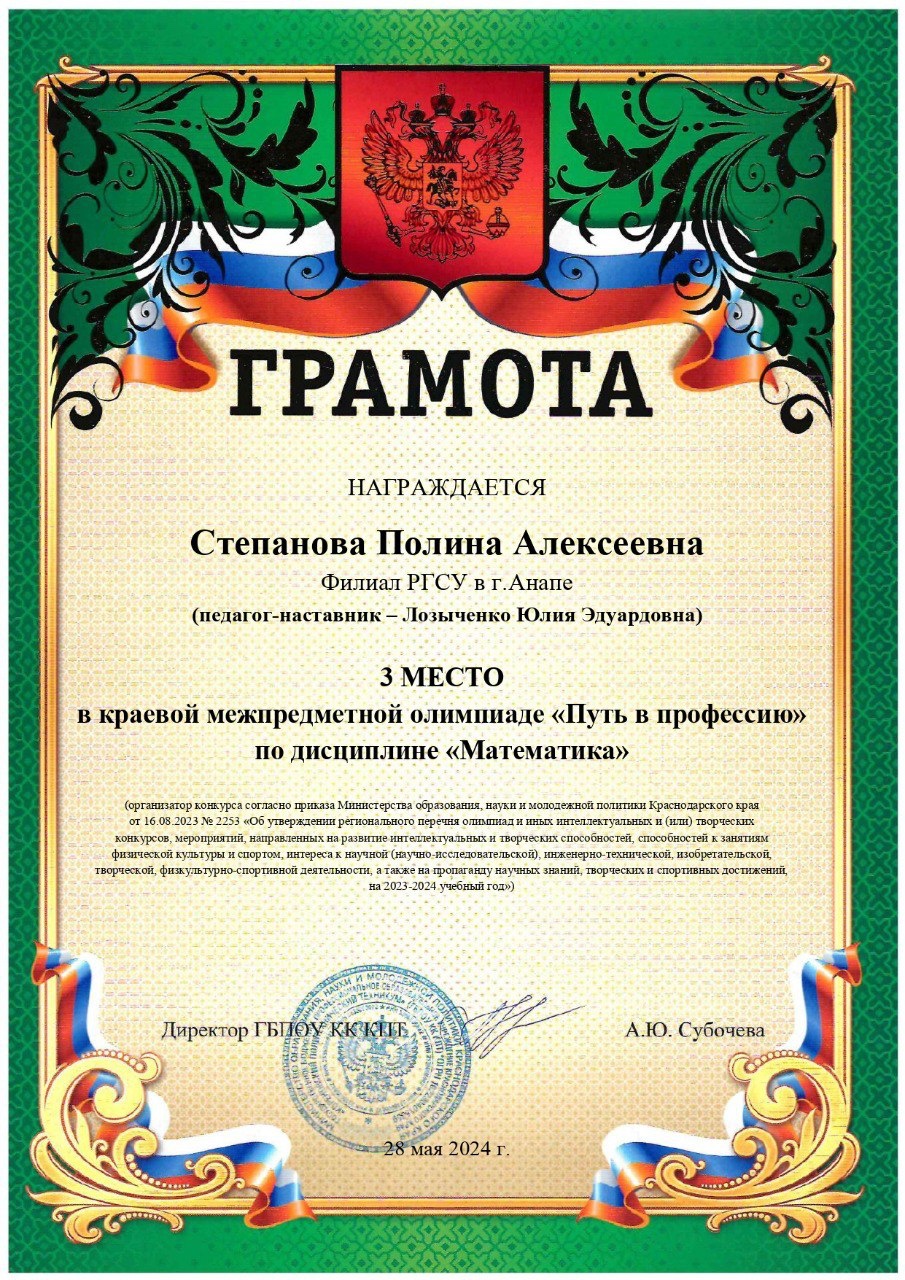 Полина Алексеевна Степанова по дисциплине «Математика» (педагог-наставник: Юлия Эдуардовна Лозыченко )